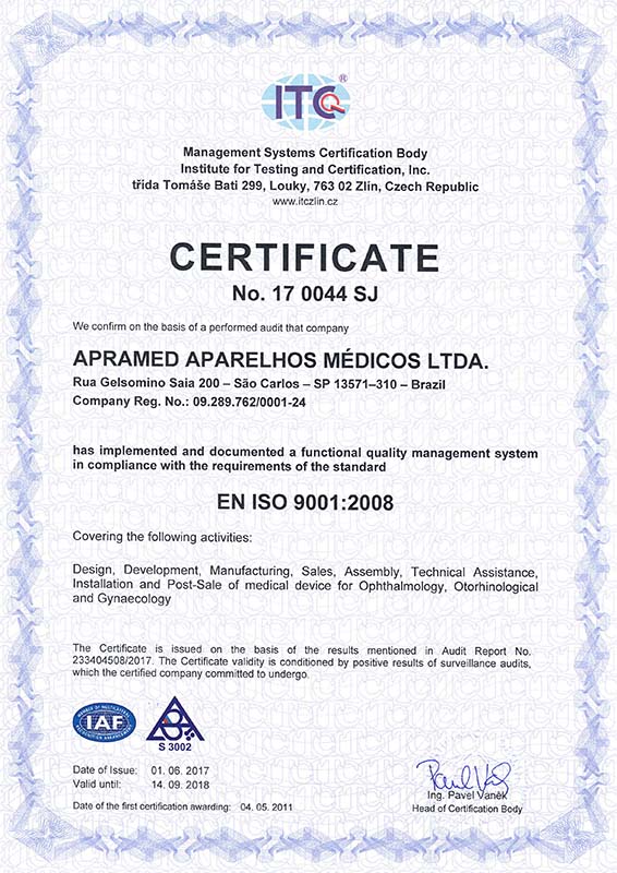 A APRAMED conquista o certificado ISO 9001:2008 e 13485:2012 para o escopo: “Desenvolvimento e Fabricação de equipamentos médicos para Oftalmologia, Otorrinologia e Ginecologia.”