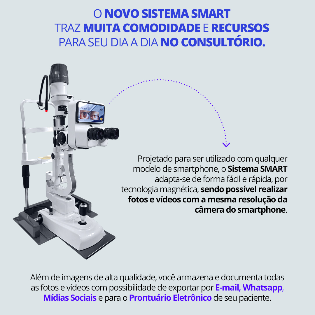 • Projetado para ser utilizado com qualquer modelo de smartphone, o Sistema SMART adapta-se de forma fácil e rápida, por tecnologia magnética, sendo possível realizar fotos e vídeos com a mesma resolução da câmera do smartphone.